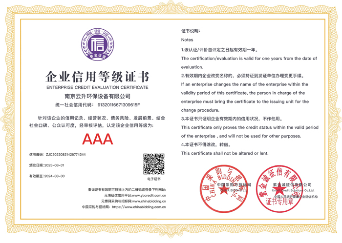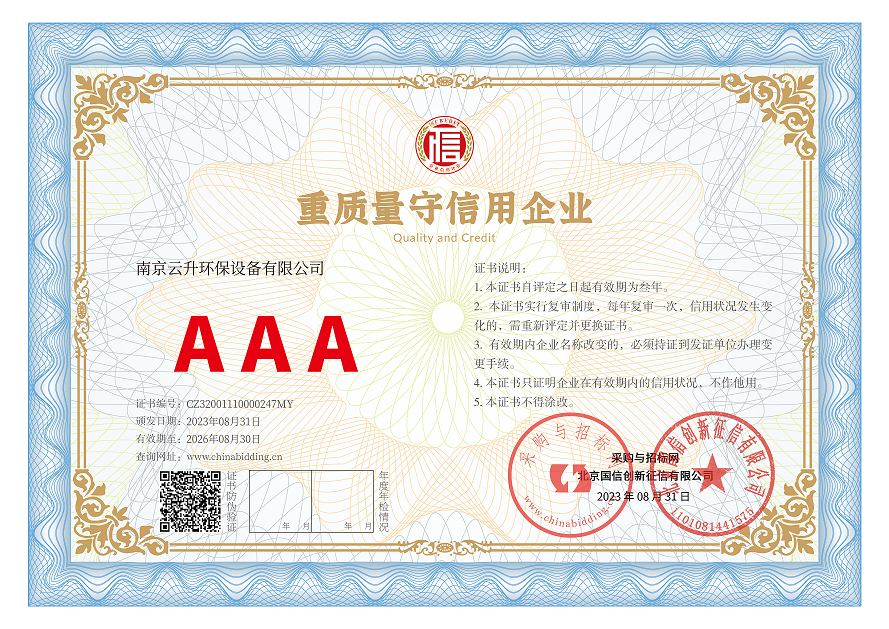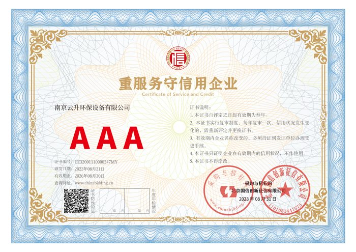 南京云升環(huán)保設(shè)備有限公司全體員工愿以環(huán)境保護(hù)為己任,以市場(chǎng)為導(dǎo)向,以優(yōu)質(zhì)服務(wù)為原則,嚴(yán)格的管理、先進(jìn)的生產(chǎn)工藝、至上的品質(zhì)、完善的售前售后服務(wù),與廣大新老用戶攜手并進(jìn),共鑄輝煌。公司已通過(guò)ISO9001:2000質(zhì)量管理體系標(biāo)準(zhǔn)認(rèn)證,成為江蘇省高新企業(yè),并進(jìn)行不斷的技術(shù)改進(jìn)和創(chuàng)新,為客戶和合作伙伴提供滿意的產(chǎn)品。